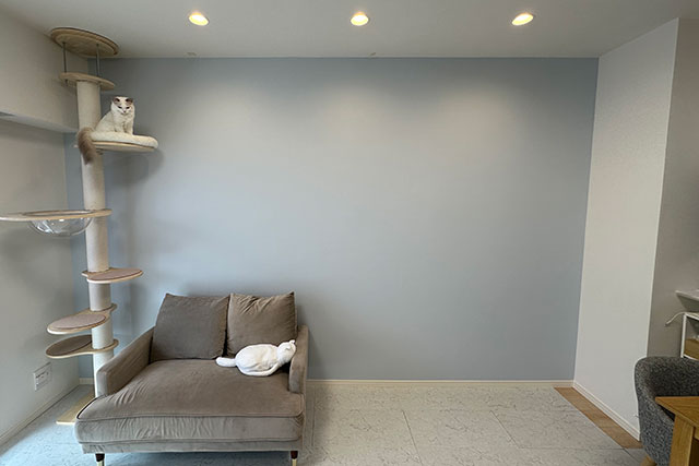 リビングでキャットタワーの背景になる一面をベージュ色の壁紙からパステルカラーの塗り壁調の壁紙に張り替えました。