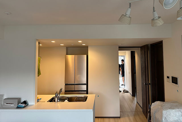 天井の壁紙を剥がす際にも切れ端や埃などが落ちますので流し台や冷蔵庫など養生が必要な箇所に適した養生を行います。