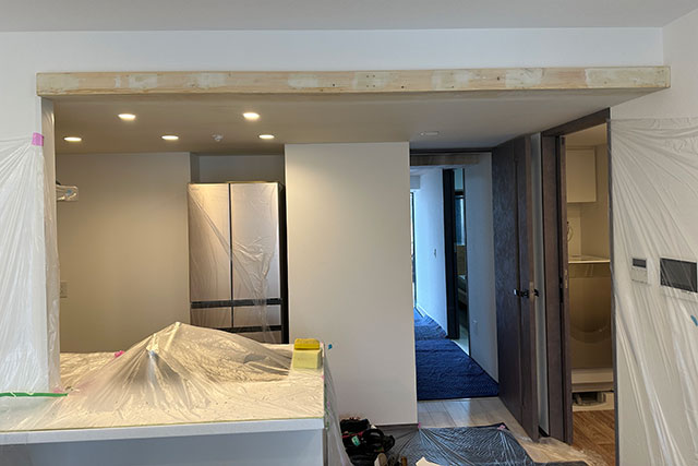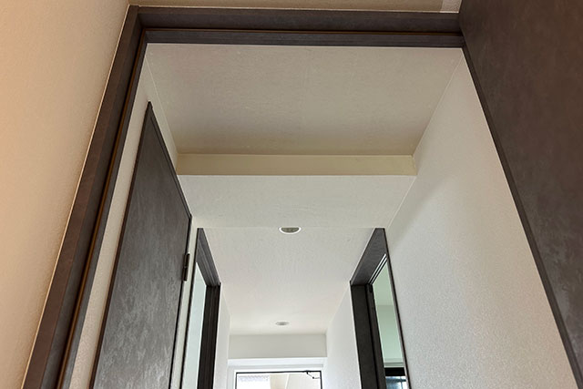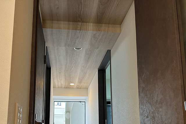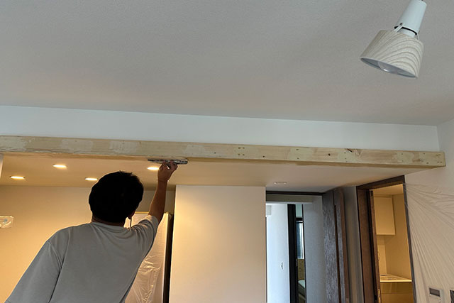 壁紙を張ると取り付けた木材部分が立体的になって下がり天井のような雰囲気が出ます。