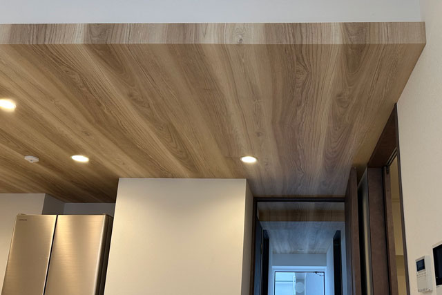 キッチンと廊下の天井をチーク材の木目柄で張り替えをしました。