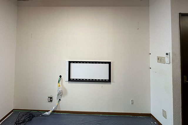 毛布養生などをして、お客様と一緒にテレビを外してから壁紙を剥がしました。