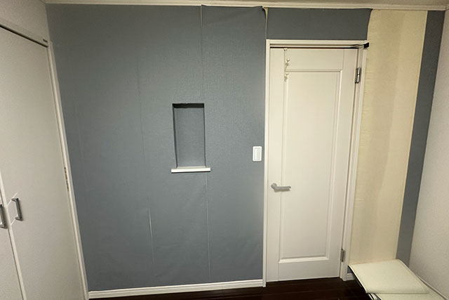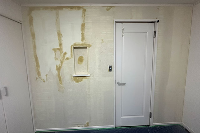 養生を施した後に既存の壁紙を剥がしたところ両面テープで下地が損傷していましたので、パテ処理で補修をしました。