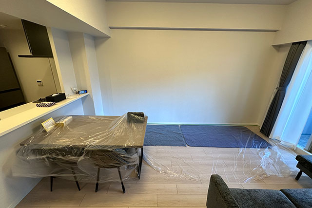 作業を始める前に養生を念入りに行います。 床には毛布養生をさせて頂き、ダイニングテーブルにもビニール養生を施しました。