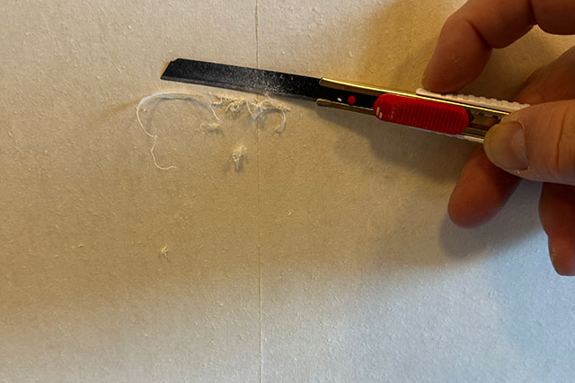 標準の壁紙を張った際に下敷きテープを使用せずに壁紙を張った模様で壁紙のつなぎ目部分にカッターナイフの刃が入ってしまい盛り上がってしまっていましたので、丁寧に盛り上がった部分を削ぎ落として調整しなければなりませんでした。