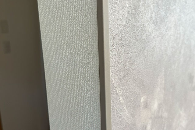 張り替え対象面の裏側にも壁面が回り込んでいますので、見切り材を取り付けて剥がれ防止を行っています。
